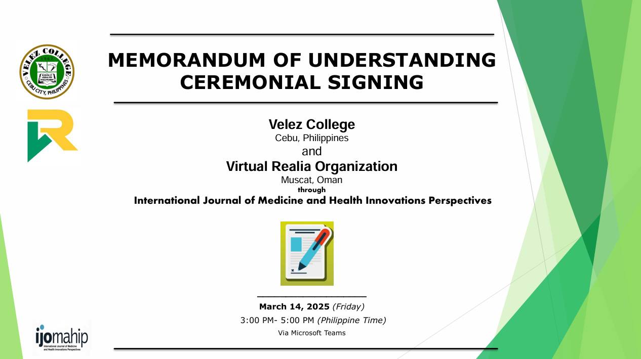 Cebu, Philippines — In a significant step towards advancing Allied Health Science education, research, theory and practice, Velez College in Cebu, Philippines, has entered into a formal partnership with the Virtual Realia Organization (VRO), which operates its International Office in Muscat, Oman, and its National Office in Laguna, Philippines. The Memorandum of Understanding (MOU) was signed on March 14, 2025, via Microsoft Teams, with the International Journal of Medicine and Health Innovations Perspectives (IJOMAHIP) overseeing the event. Dr. Edsel P. Inocian, the Chief Editor of IJOMAHIP and a proud alumnus of Velez College’s Medical Technology program, was instrumental in bringing this collaboration to life. The signing ceremony took place from 3:00 PM to 5:00 PM Philippine Time and kicked off with a series of warm introductory activities, including doxologies and the national anthems of both the Philippines and Oman. Following that, video presentations from Velez College and VRO set an inspiring tone for the formal proceedings.